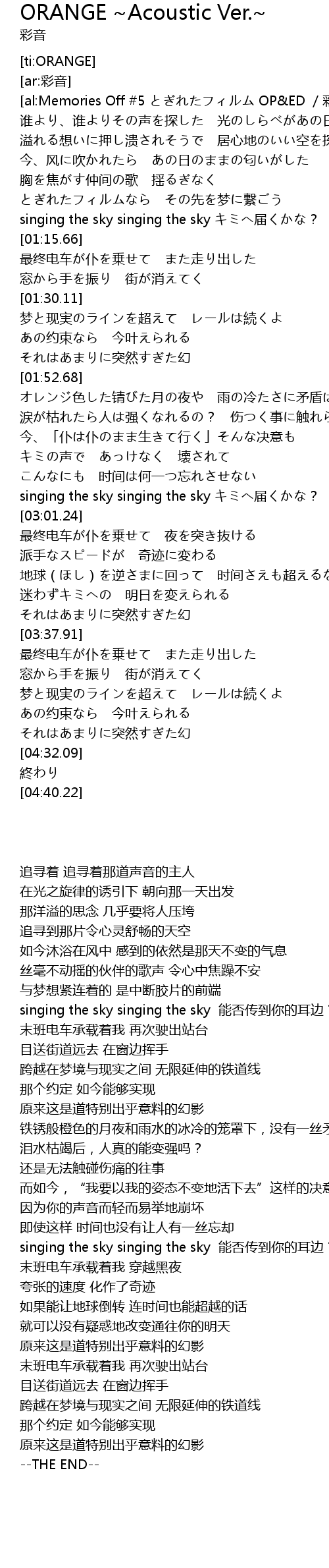 | [02:54.42] | singing the sky singing the sky キミへ届くかな? |