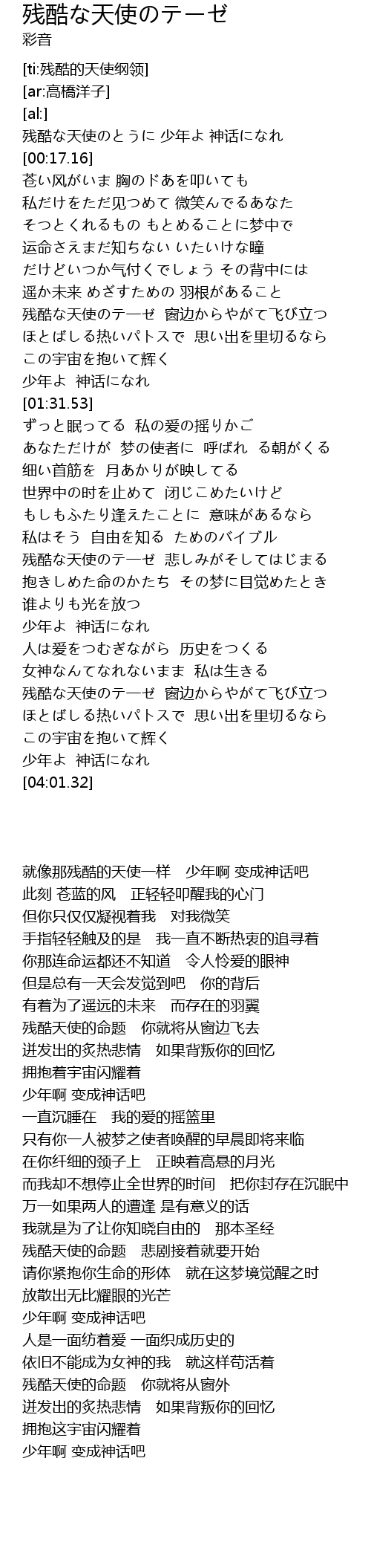 | [00:03.12] | 残酷な天使のとうに 少年よ 神话になれ |