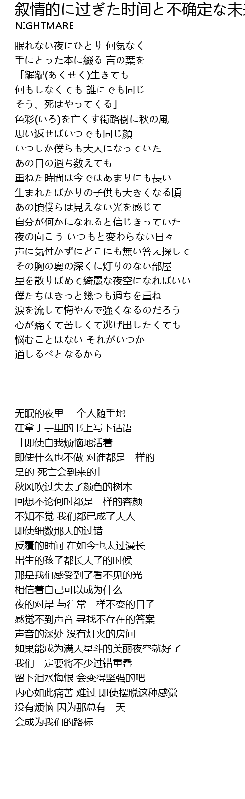 | [02:16.080] | 夜の向こう いつもと変わらない日々 |