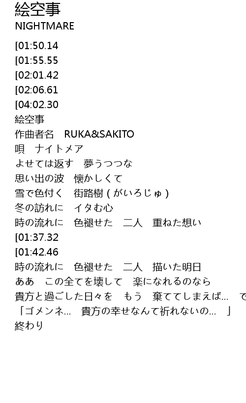 | [03:00.88][01:42.46] | 鮮やかな記憶 全て 絵空事 |
