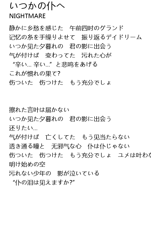 | 伤ついた 伤つけた もう充分でしょ ユメは叶わない | |