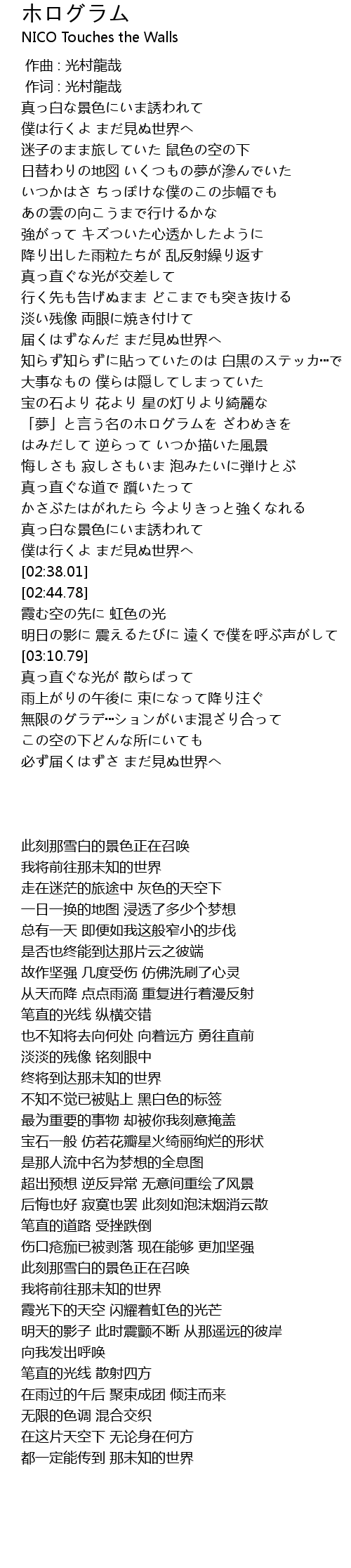 | [02:58.53] | 明日の影に 震えるたびに 遠くで僕を呼ぶ声がして |