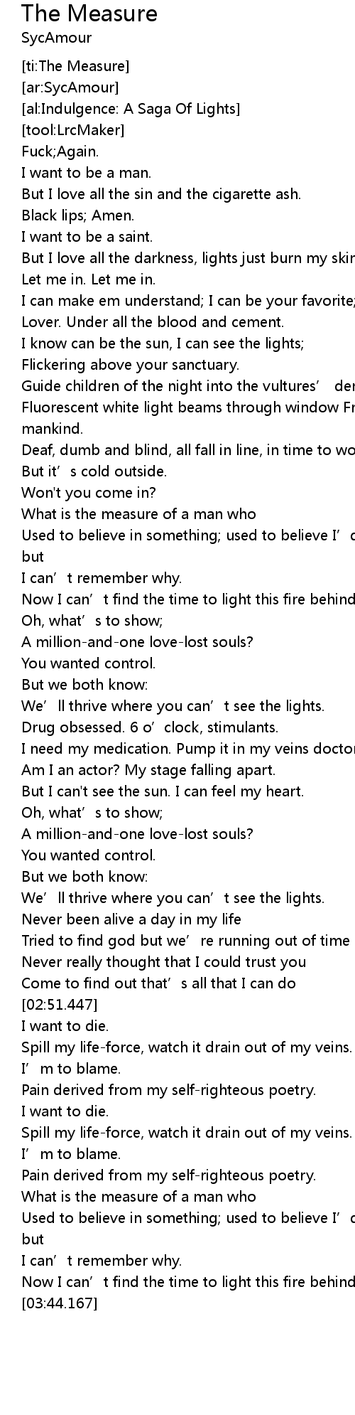 | [03:37.183] | Now I can’t find the time to light this fire behind my eyes. |