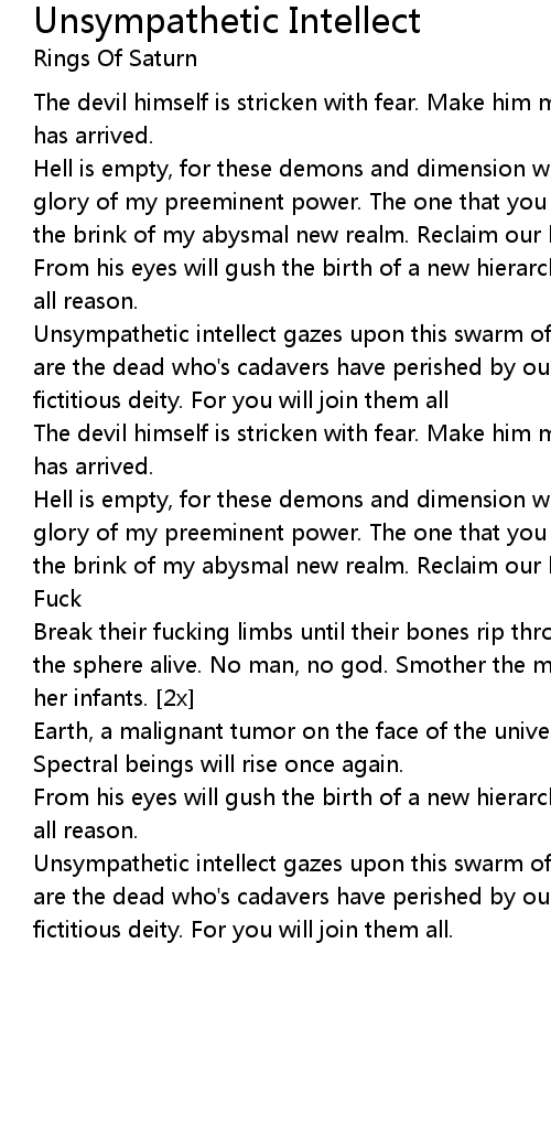 Unsympathetic intellect gazes upon this swarm of mortals in revulsion. Blessed are the dead who's cadavers have perished by our hand. For you will join your fictitious deity. For you will join them all |