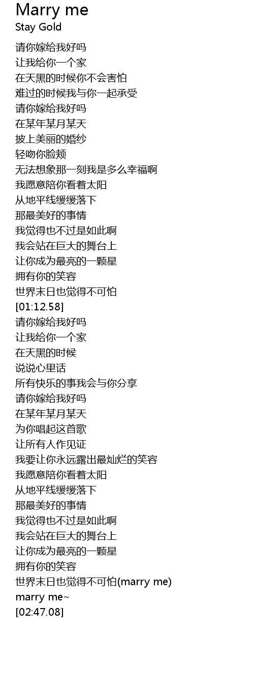 | [02:12.93] | 世界末日也觉得不可怕(marry me) |