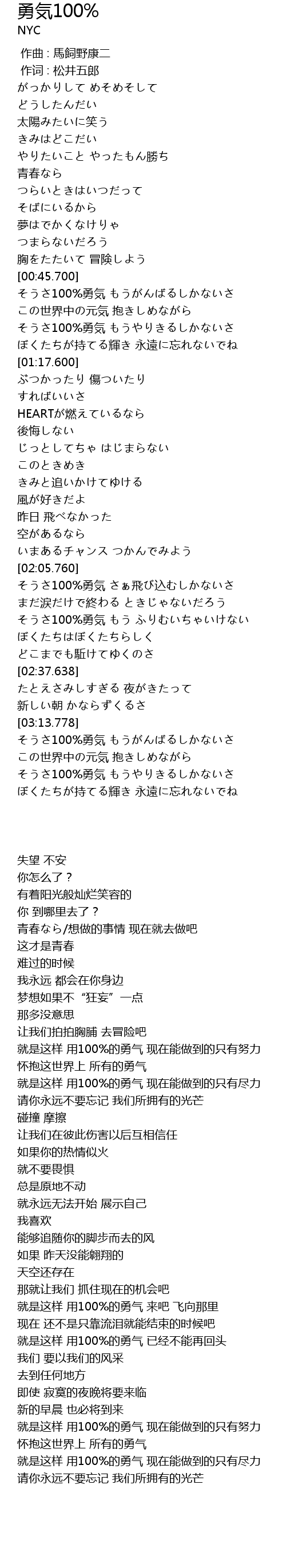 | [00:46.200] | そうさ100%勇気 もうがんばるしかないさ |
