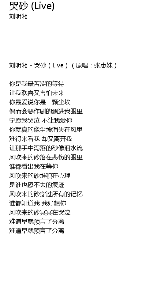 | 刘明湘 - 哭砂(Live)(原唱:张惠妹) | |