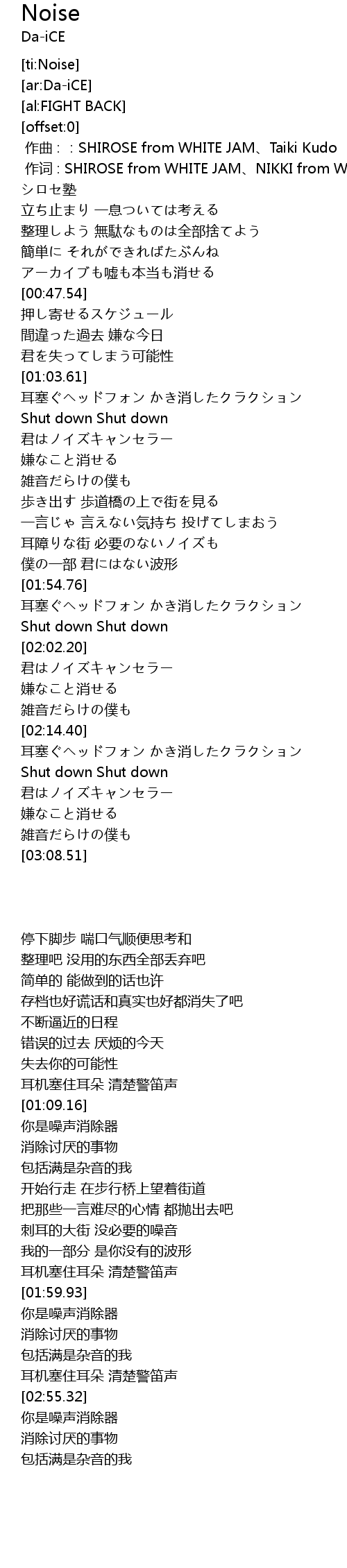 | [00:01.00] | 作词 : SHIROSE from WHITE JAM、NIKKI from WHITE JAM、NOA from シロセ塾 |