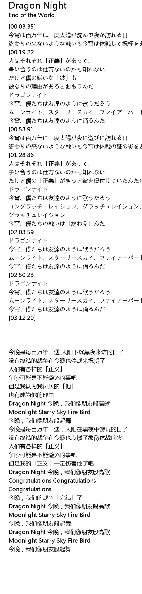 | [00:38.56] | ドラゴンナイト 今宵、僕たちは友達のように歌うだろう |