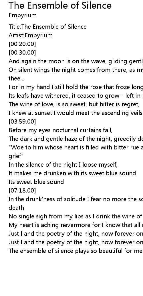 | [09:11.28] | The ensemble of silence plays so beautiful for me... . |