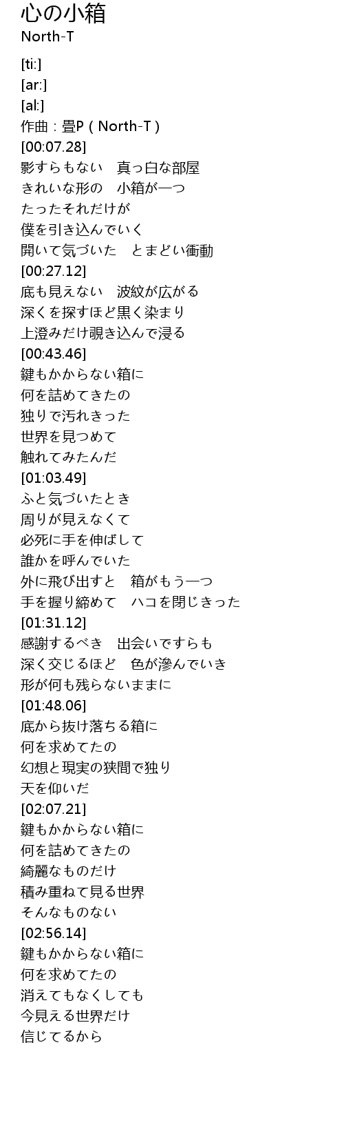 | [01:26.50] | 手を握り締めて ハコを閉じきった |
