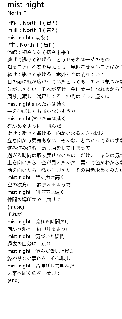 | [04:00.15] | mist night 背伸びして叫んだ |