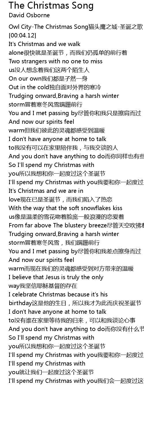 | [00:00.00] | Owl City-The Christmas Song猫头鹰之城-圣诞之歌 |