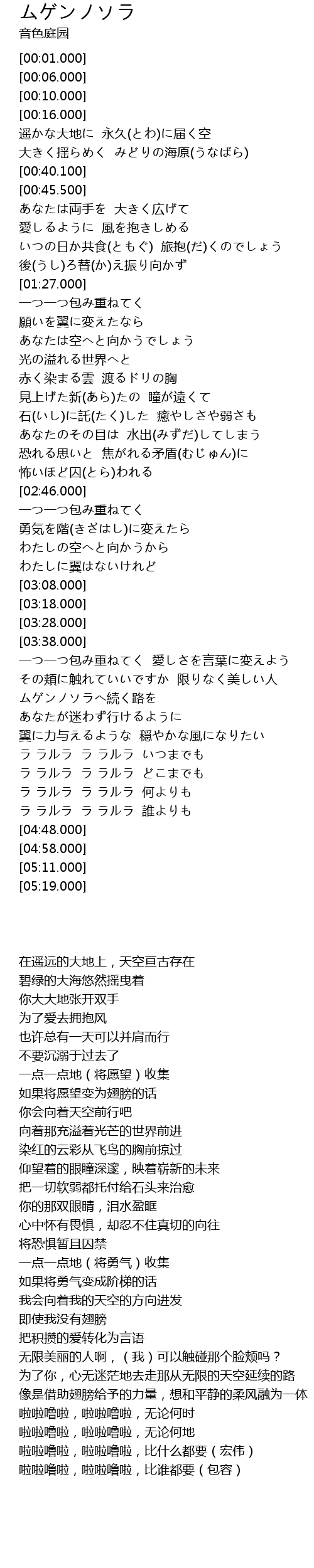 | [04:07.600] | ムゲンノソラへ続く路を あなたが迷わず行けるように |