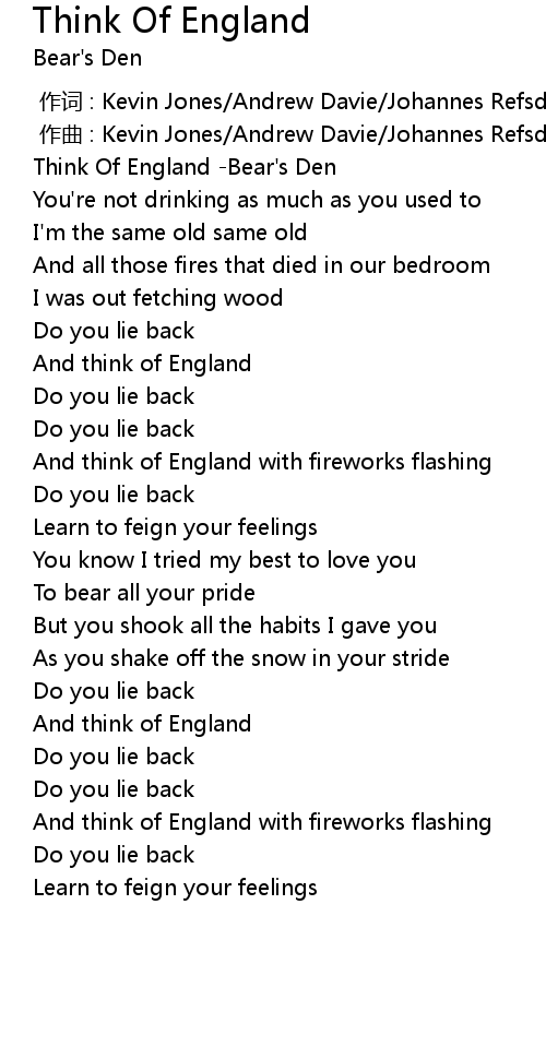 | [00:00.00] | Think Of England Bear' s Den |