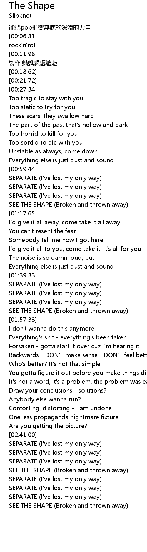 | [01:53.18] | SEE THE SHAPE (Broken and thrown away) |