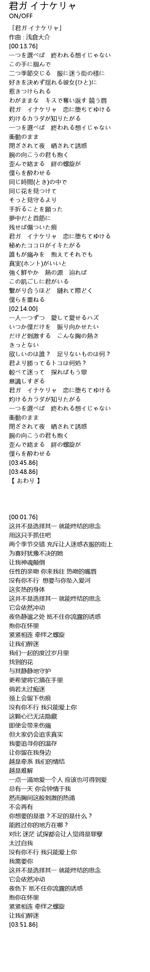 | [01:42.58] | 君ガ イナケリャ 恋に堕ちてゆける |