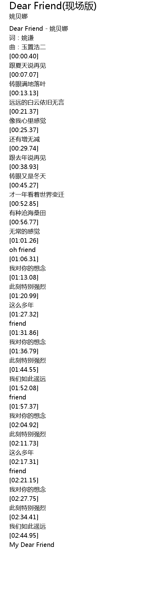 | [00:00.10] | Dear Friend - 姚贝娜 |