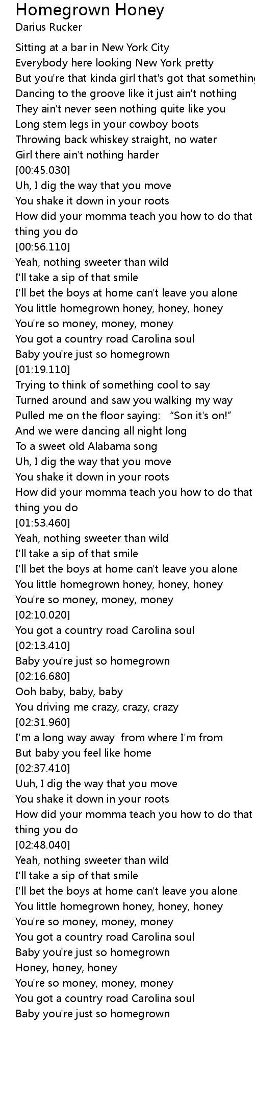 | [01:06.440] | You little homegrown honey, honey, honey |