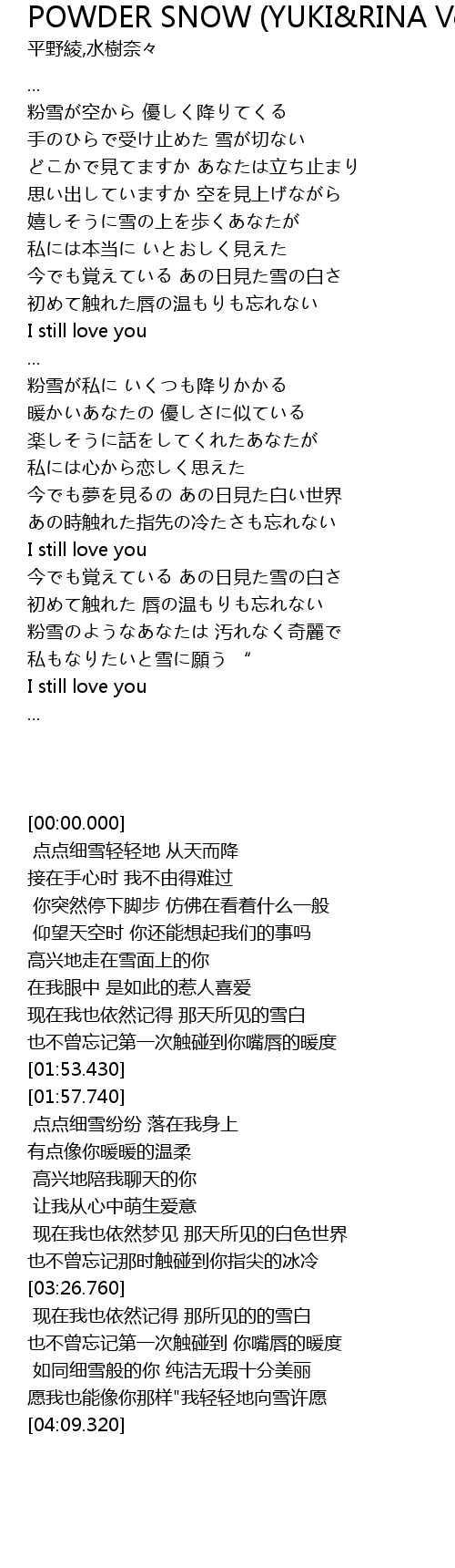 | [01:33.360] | 今でも覚えている あの日見た雪の白さ |
