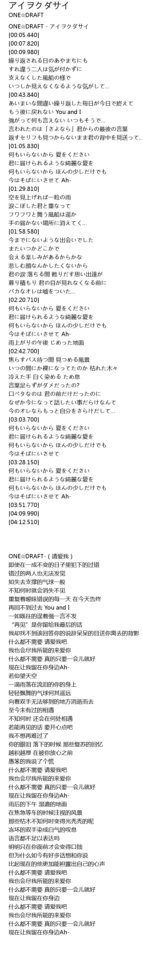 | [00:03.900] | ONE☆DRAFT - アイヲクダサイ |