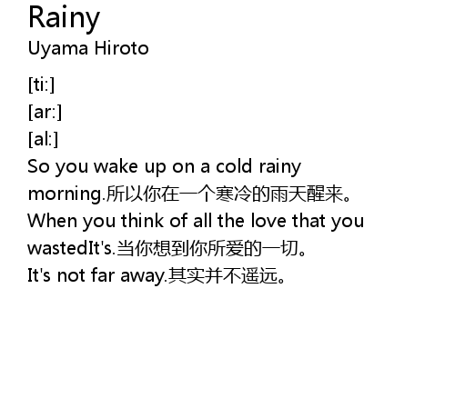| [00:23.00] | So you wake up on a cold rainy morning. suǒ yǐ nǐ zài yí gè hán lěng de yǔ tiān xǐng lái. |