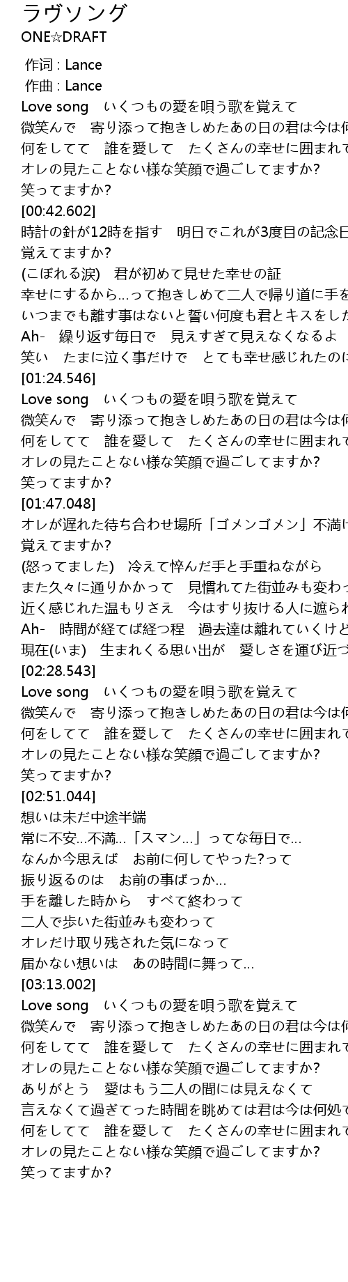 | [03:22.998] | Love song いくつもの愛を唄う歌を覚えて |