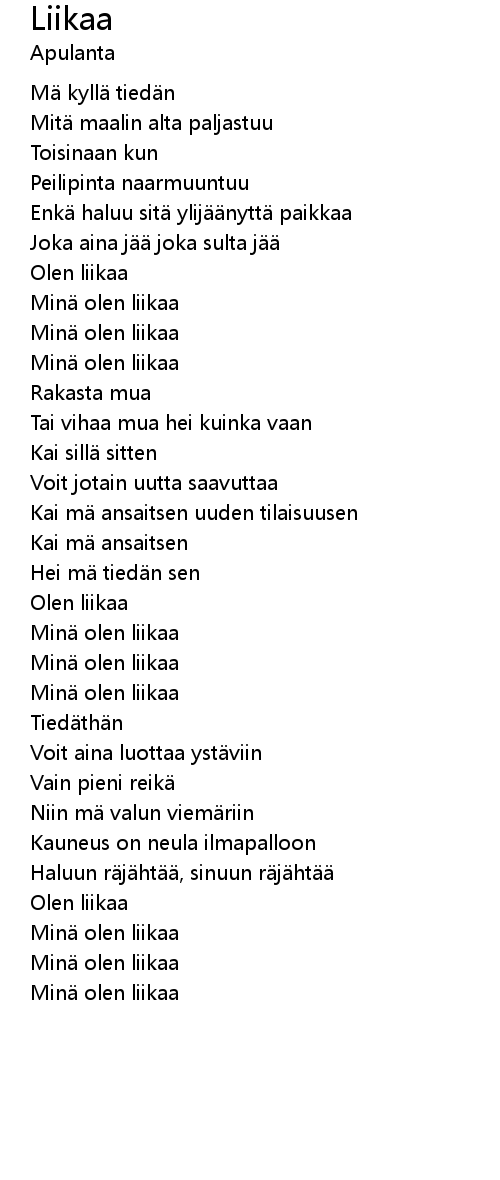 | Enkä haluu sitä ylijäänyttä paikkaa | |