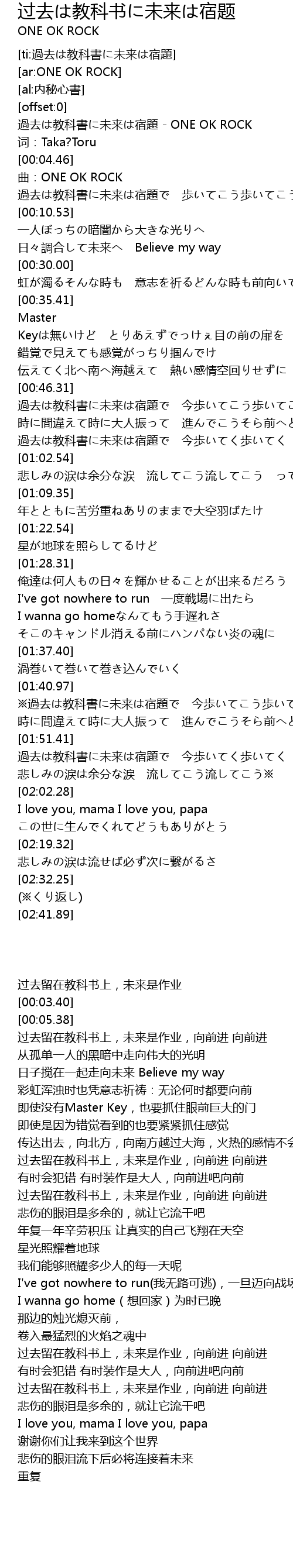 | [00:01.19] | 過去は教科書に未来は宿題 - ONE OK ROCK |