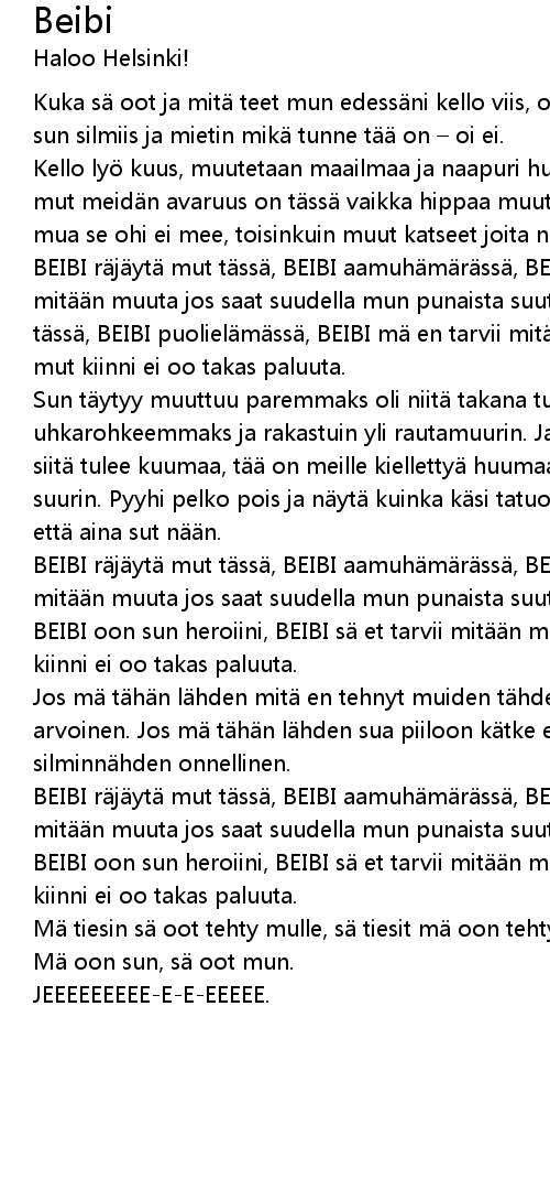 | BEIBI r j yt mut t ss, BEIBI aamuh m r ss, BEIBI s et tarvii mit n muuta jos saat suudella mun punaista suuta. BEIBI tartu muhun kiinni, BEIBI oon sun heroiini, BEIBI s et tarvii mit n muuta jos s saat mut kiinni ei oo takas paluuta. | |
