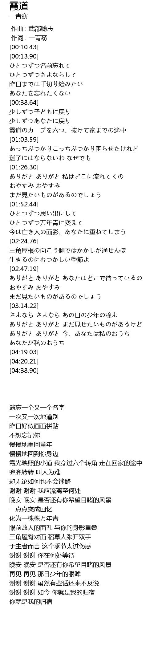 | [00:51.67] | 霞道のカーブを六つ、抜けて家までの途中 |