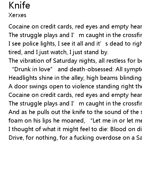 | I see police lights, I see it all and it’s dead to rights where my soul is tired, and I just watch, I just stand by. | |