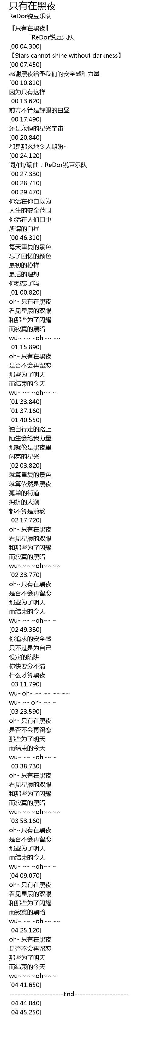 | [00:25.720] | 词/曲/编曲:ReDor锐豆乐队 |