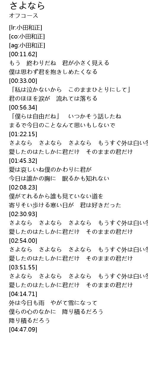 | [01:23.24] | さよなら さよなら さよなら もうすぐ外は白い冬 |