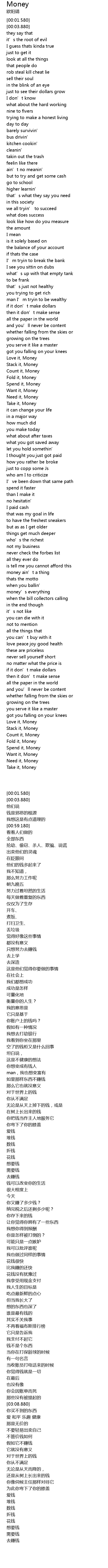 | [03:00.600] | money’s everything |