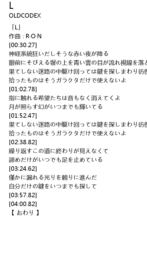 | [00:48.25] | 果てしない迷路の中駆け回っては鍵を探しまわり彷徨って |