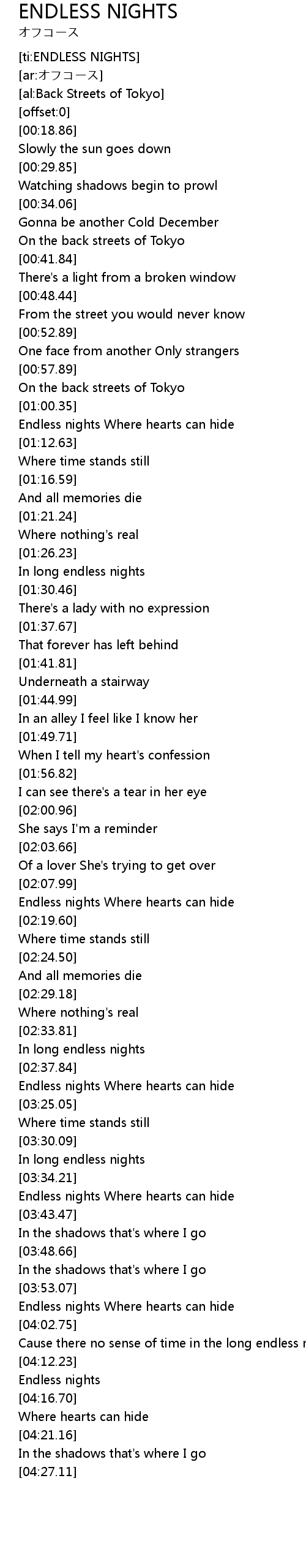 | [04:08.53] | Cause there no sense of time in the long endless nights |