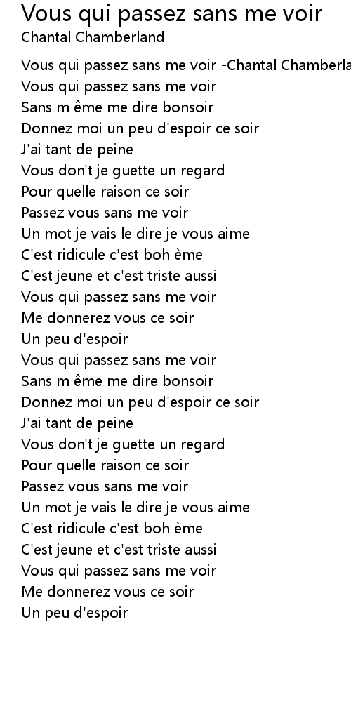 | [00:00.213] | Vous qui passez sans me voir Chantal Chamberland |