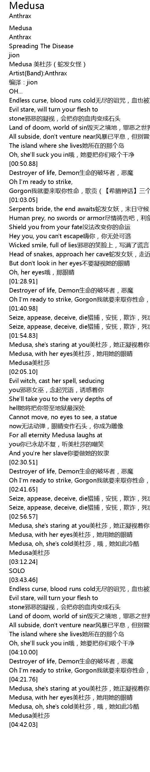 | [03:04.31] | Medusa, oh, she' s cold měi dù shā, ó, tā rú cǐ lěng kù |