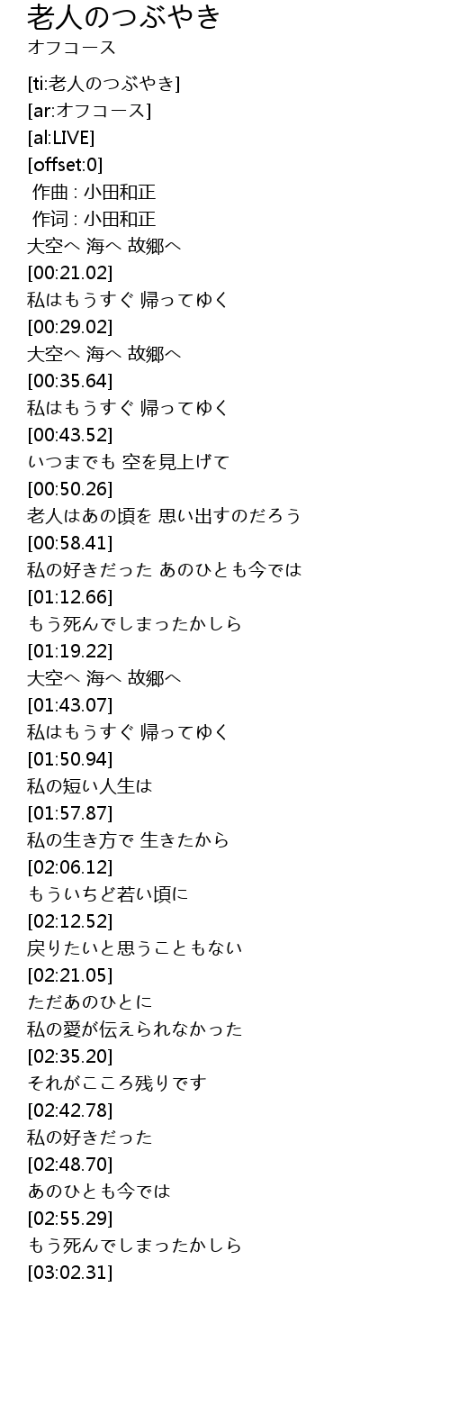 | [00:51.49] | 老人はあの頃を 思い出すのだろう |