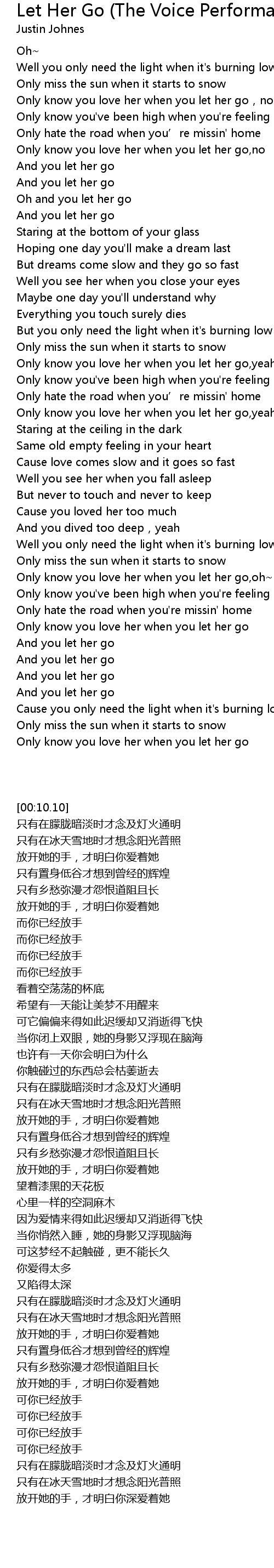| [02:13.84] | Only know you love her when you let her go,oh~ |