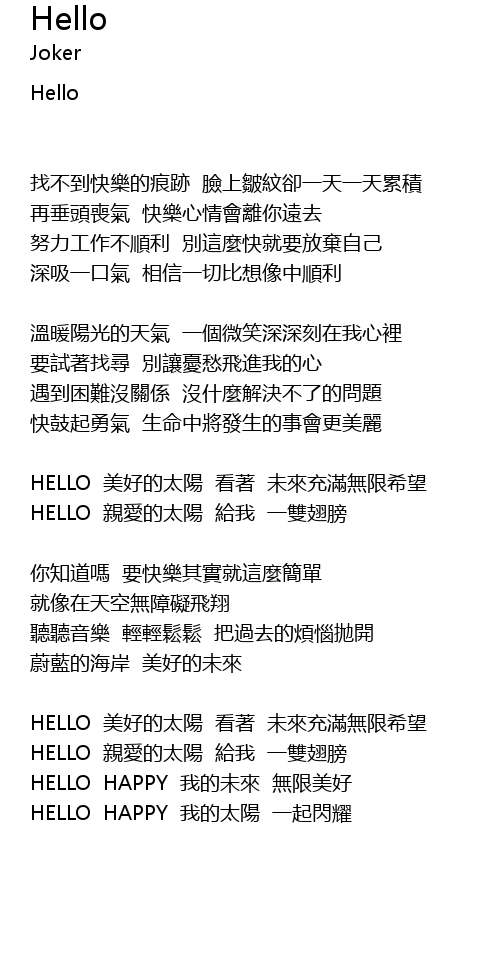 | HELLO měi hǎo de tài yáng kàn zhe wèi lái chōng mǎn wú xiàn xī wàng | |