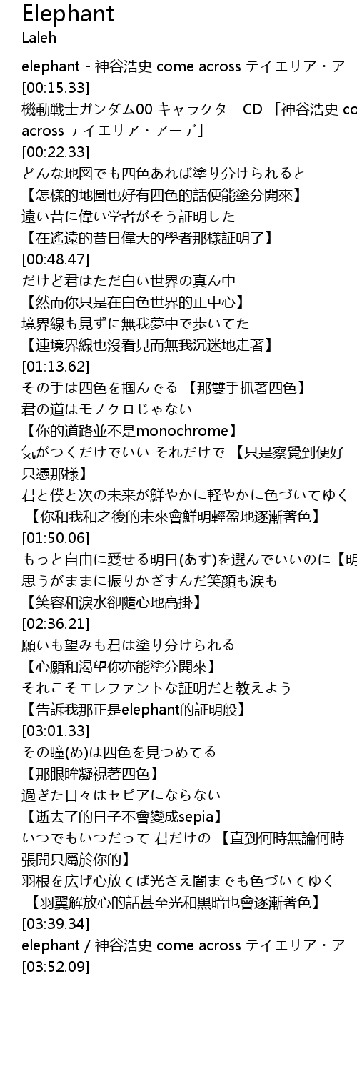 | [00:00.67] | elephant - 神谷浩史 come across テイエリア・アーデ |