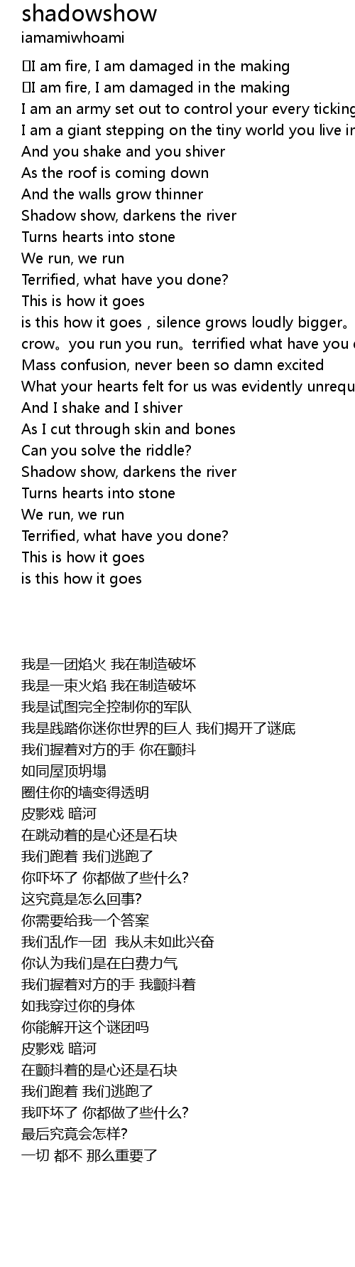 | [03:45.64] | Shadow show, darkens the river |