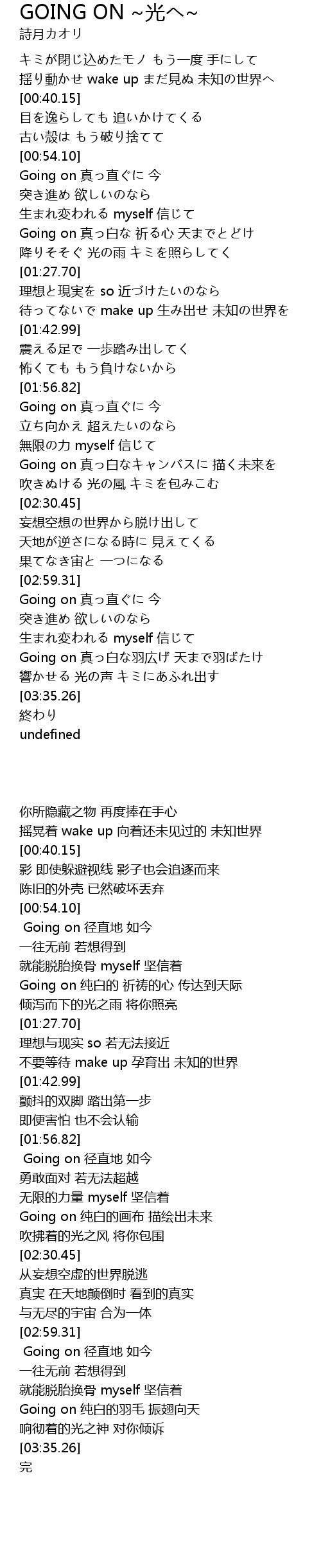 | [01:09.43] | Going on 真っ白な 祈る心 天までとどけ |