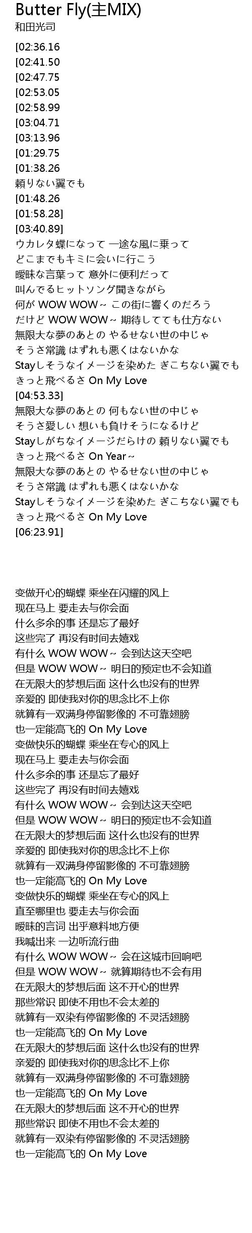 | [00:21.04][02:36.16] | ゴキゲンな蝶になって きらめく風に乗って |