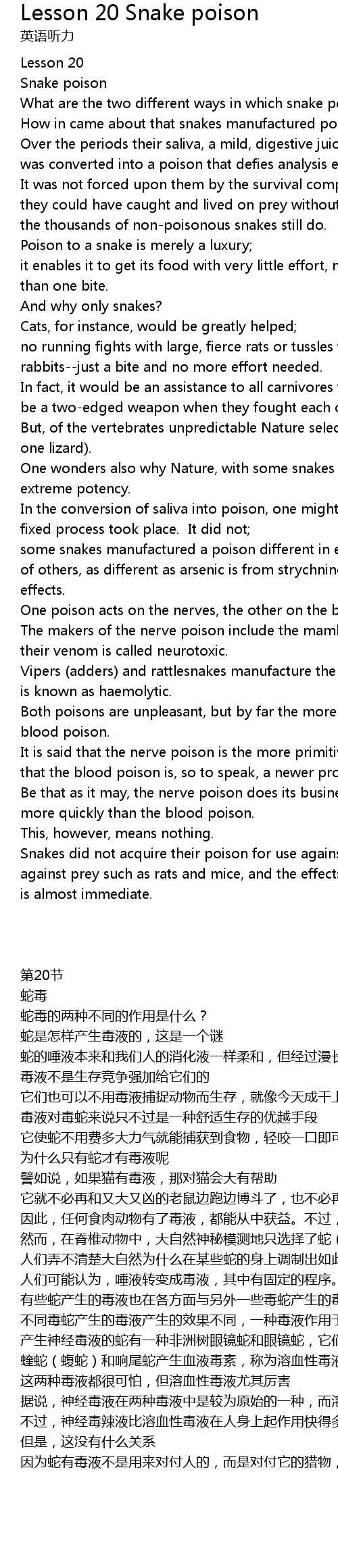 Snakes did not acquire their poison for use against man but for use against prey such as rats and mice, and the effects on these of viperine poison is almost immediate. |