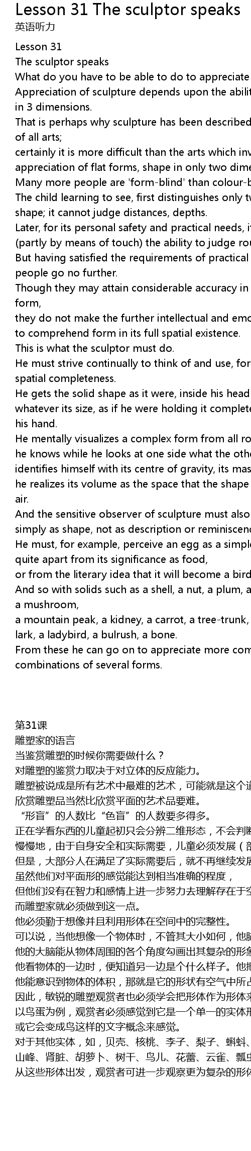 Appreciation of sculpture depends upon the ability to respond to form in 3 dimensions. |