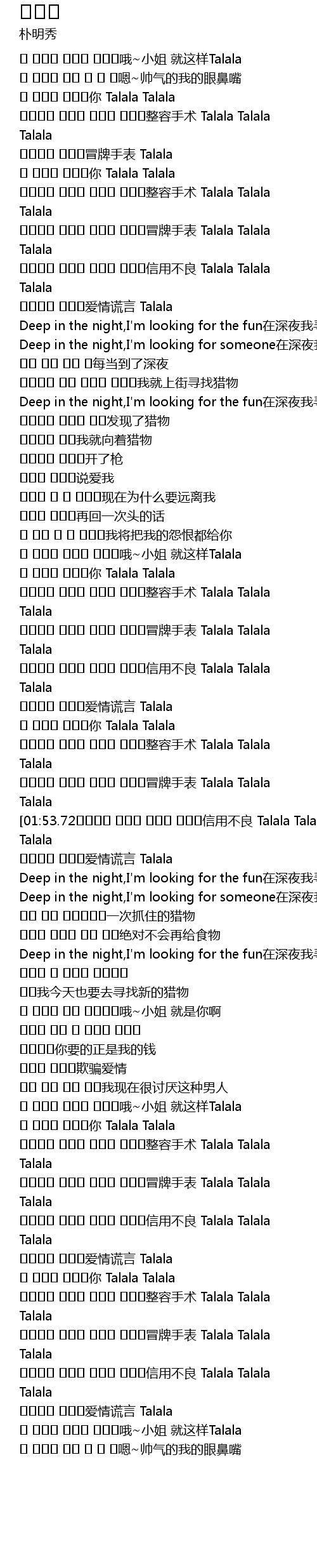 | [00:17.47] | 성형수술 탈랄라 탈랄라 탈랄라整容手术 Talala Talala Talala |