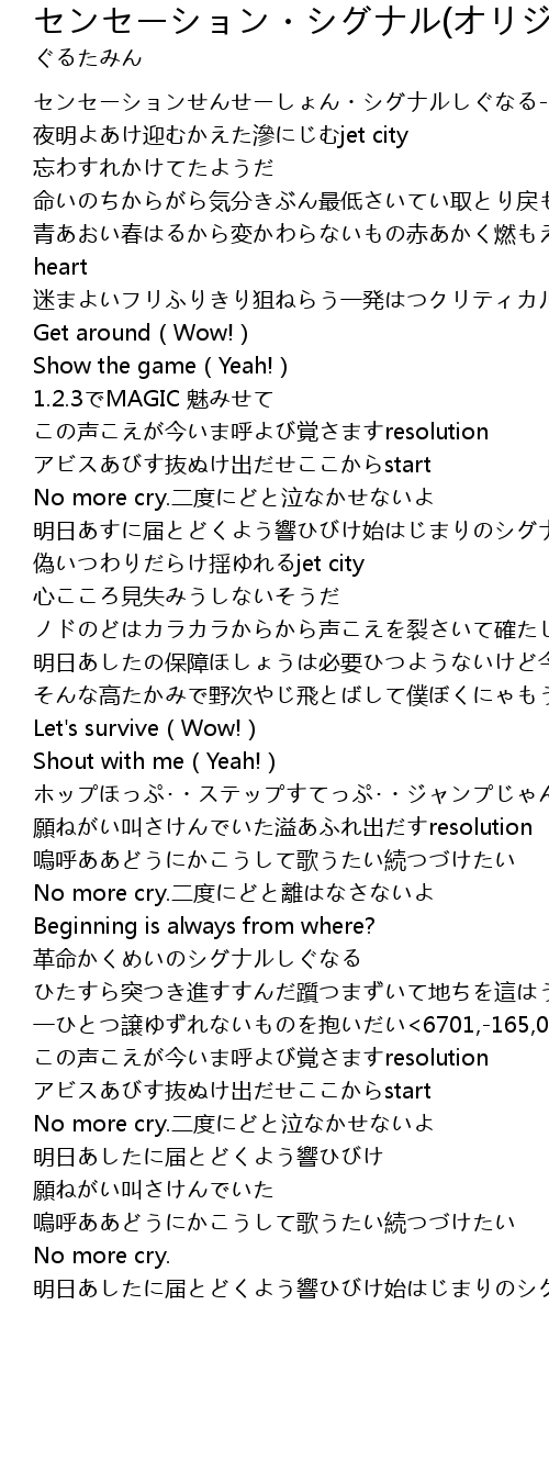 | [00:00.535] | センセーションせんせーしょん・シグナルしぐなる-ぐるたみん |